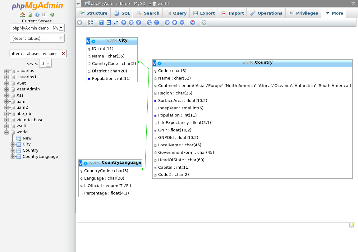 The demo is running on MySQL and MariaDB. phpMyAdmin has enabled additional relational features and MIME transformations.